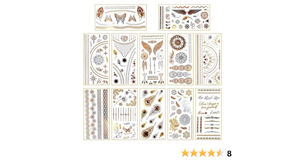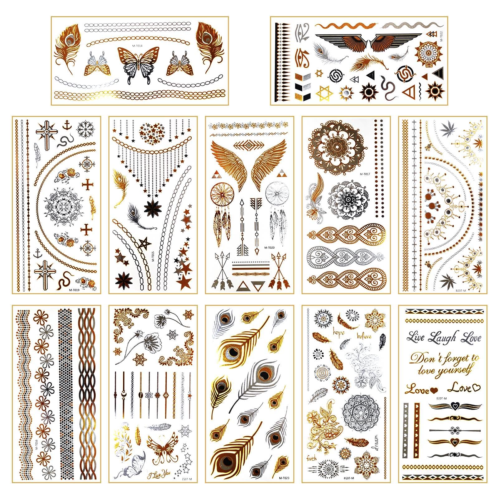 Xindy 12 Sheets Metallic Temporary Tattoos 150 Shimmer Designs Black Silver Gold Tattoos Temporary Feather Butterfly Jewellery Tattoos Flash Fake Waterproof Tattoo For Women Girls Body Art Amazon Co Uk Beauty